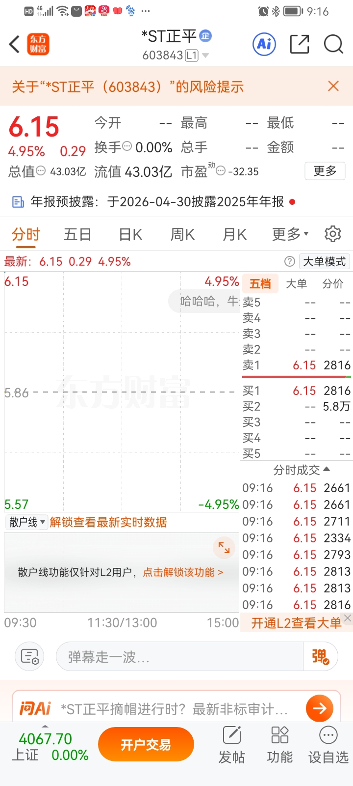 $*ST正平(SH603843)$ 正平今天可能会打开。看好的盯紧。$*ST东易(SZ002713)$ $ST赛为(SZ300044)$