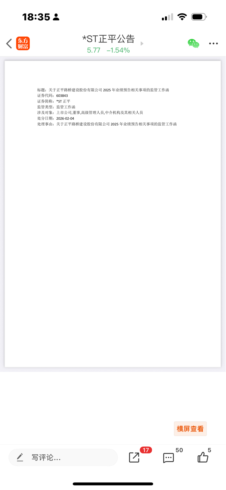 首先这个监管函是上交所对正平年报预告业绩存疑的正常监管流程。看到业绩负的是正常,看到净资产为正认为不正常,要公司给个解释。到时解释清楚了,我们也能知道公司净资产是如何做到为正的,会是更多一字板上去,所以如果有人因为这个原因打压股价的话就大胆买。