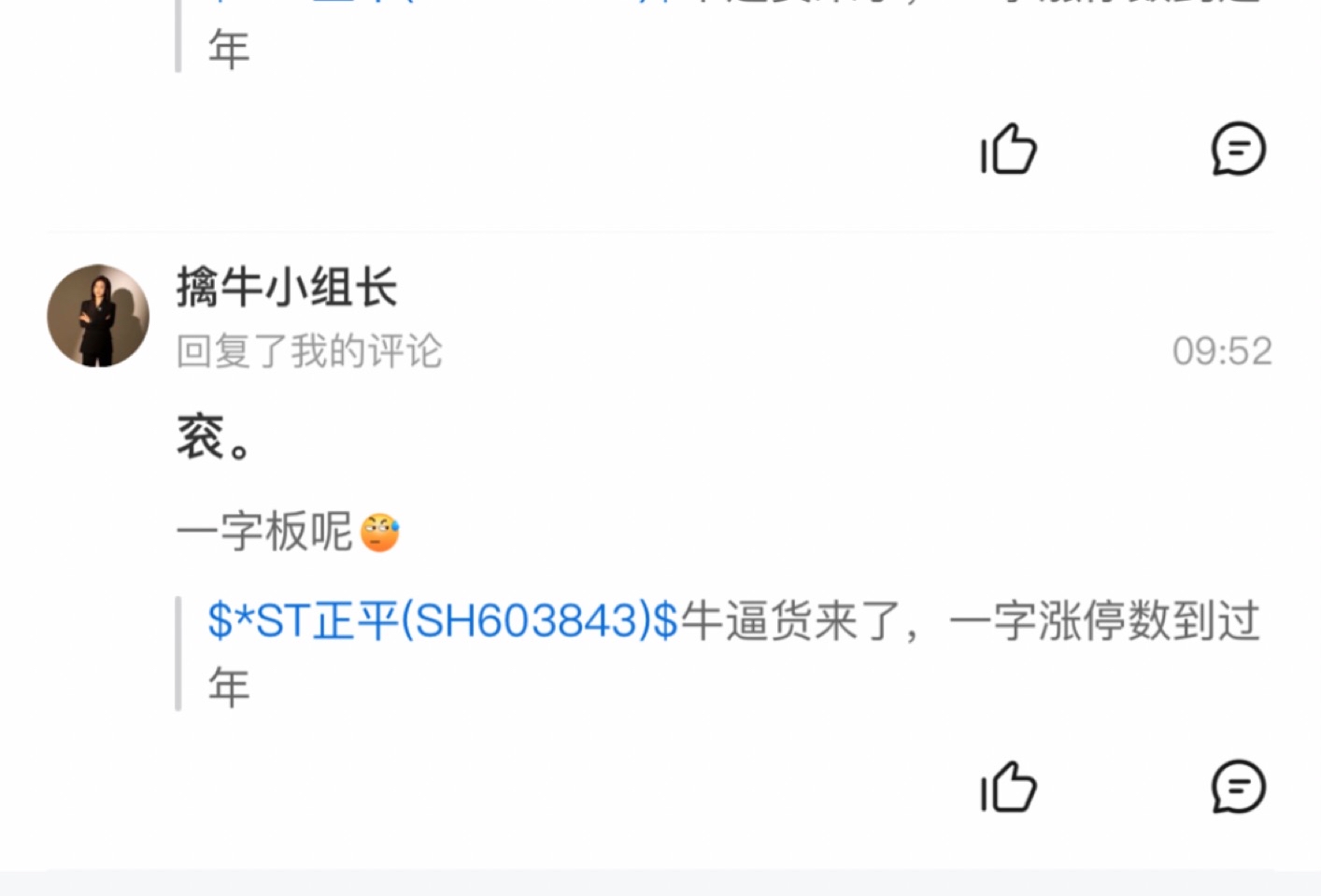 $*ST正平(SH603843)$ 昨天这个组长信誓旦旦的说板到年后,今天早上回了一句一字板,还骂人,还拉黑我,我这也没怎么着她啊