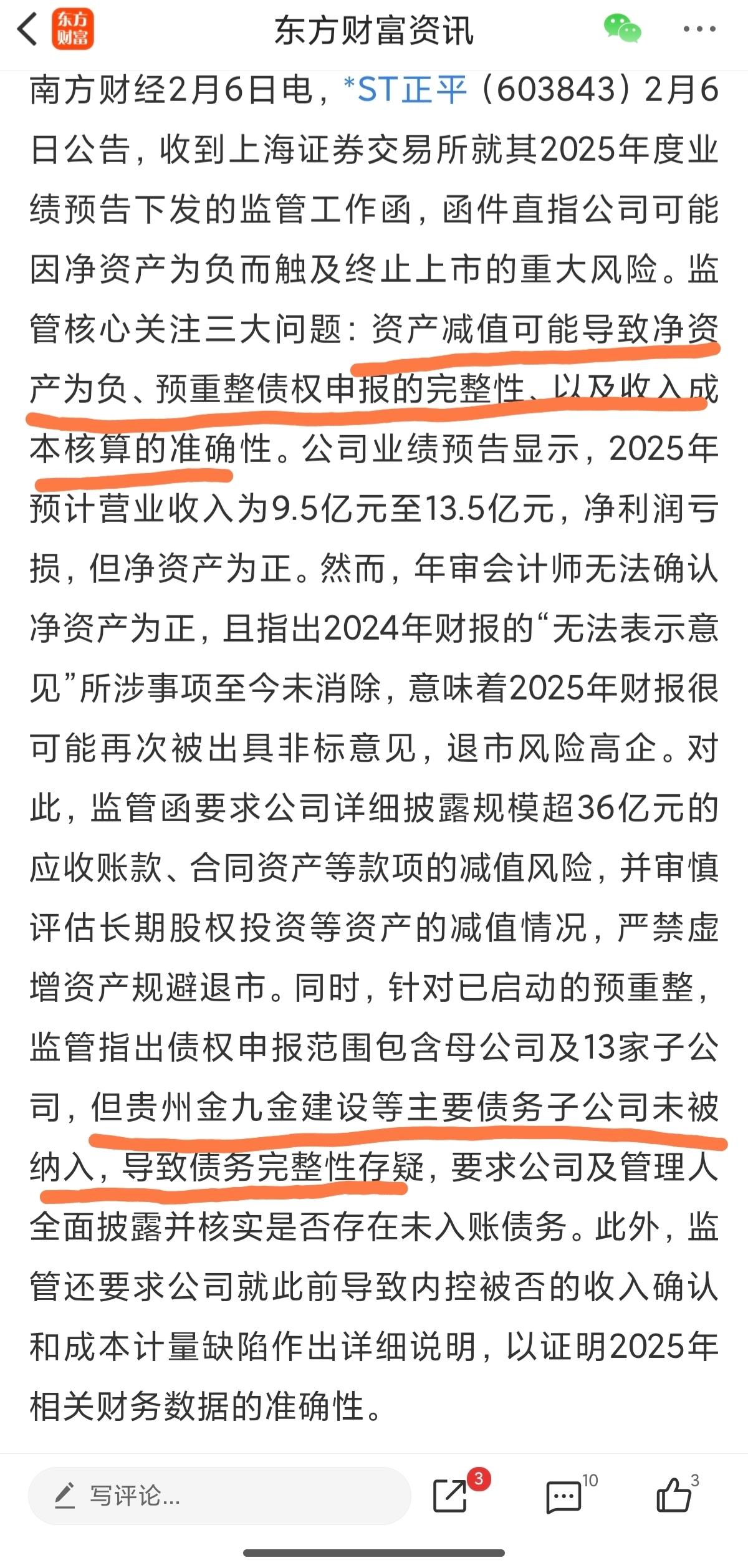 $*ST正平(SH603843)$ 给大家说一下这个事情,预重整确实通过了,确实不假,但是里面明确排除了贵州等重要的子公司,先不说净资产是否为正,就算重整成功也会因为子公司非标而退市,劝各位还是理智点,别走成万方的结局,都是烟雾弹罢了