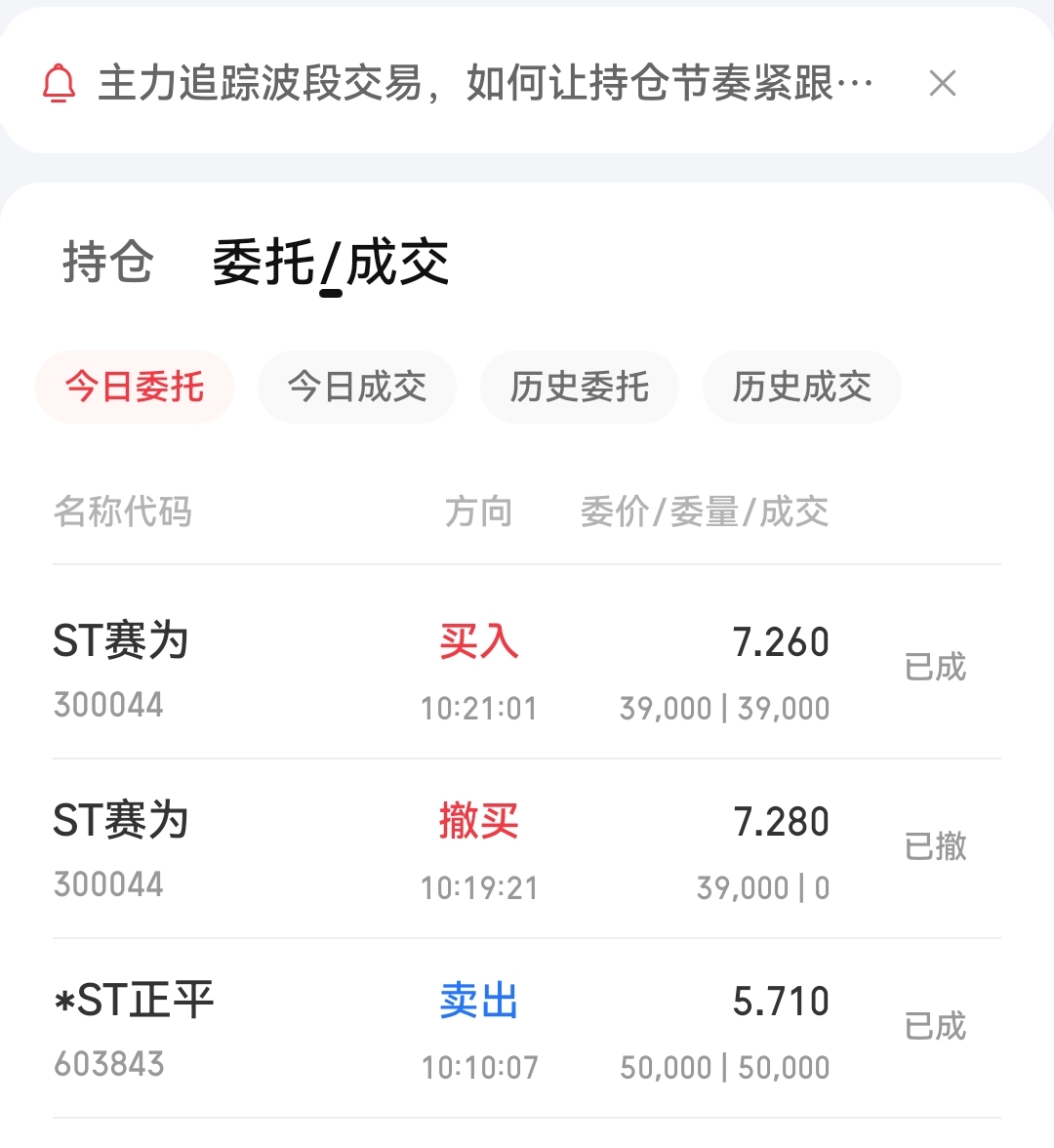 $*ST正平(SH603843)$ $ST赛为(SZ300044)$ 昨天5.6买的五万股正平没卖掉,今天给机会了,还多卖了五分钱,加仓赛为