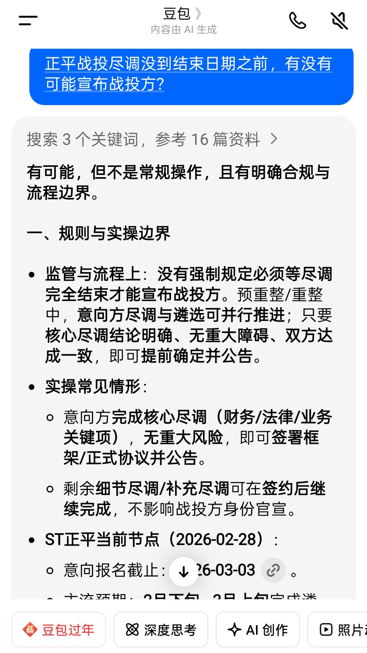 有可能3.20之前提前宣布战投。只要核心尽调结论明确、无重大障碍、双方达成一致,即可提前确定并公告。