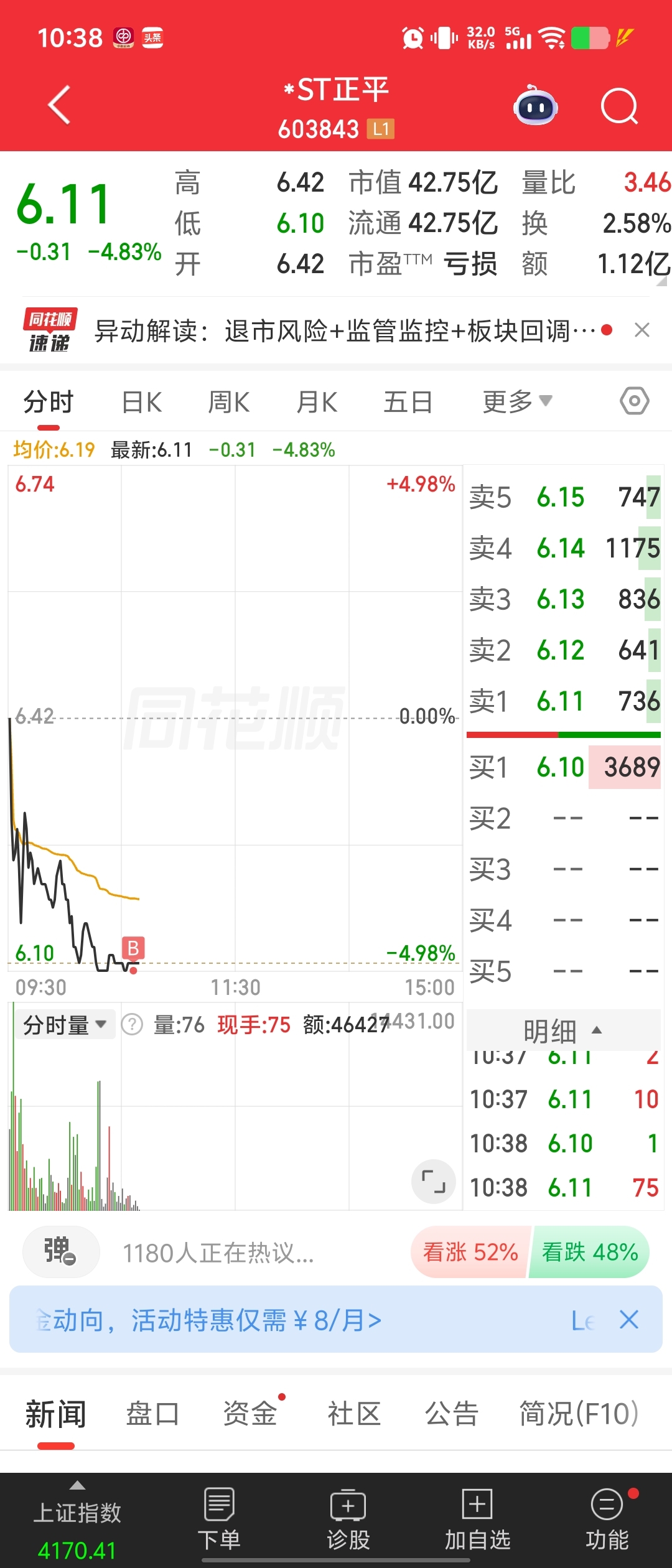 $*ST正平(SH603843)$ 昨天6.44卖的今天加回来了。