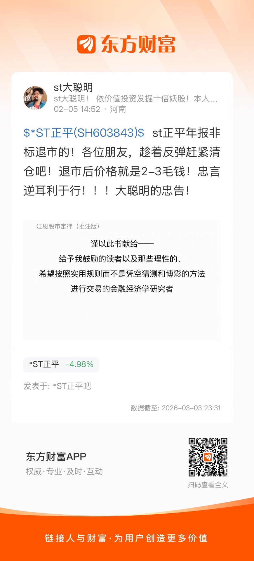 $*ST正平(SH603843)$ st正平年报非标退市的!各位朋友,趁着反弹赶紧清仓吧!退市后价格就是2-3毛钱!忠言逆耳利于行!!!大聪明的忠告!
