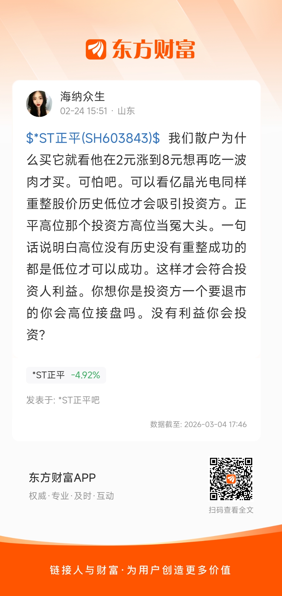 $*ST正平(SH603843)$ 我们散户为什么买它就看他在2元涨到8元想再吃一波肉才买。可怕吧。可以看亿晶光电同样重整股价历史低位才会吸引投资方。正平高位那个投资方高位当冤大头。一句话说明白高位没有历史没有重整成功的都是低位才可以成功。这样才会符合投资人利益。你想你是投资方一个要退市的你会高位接盘吗。没有利益你会投资?