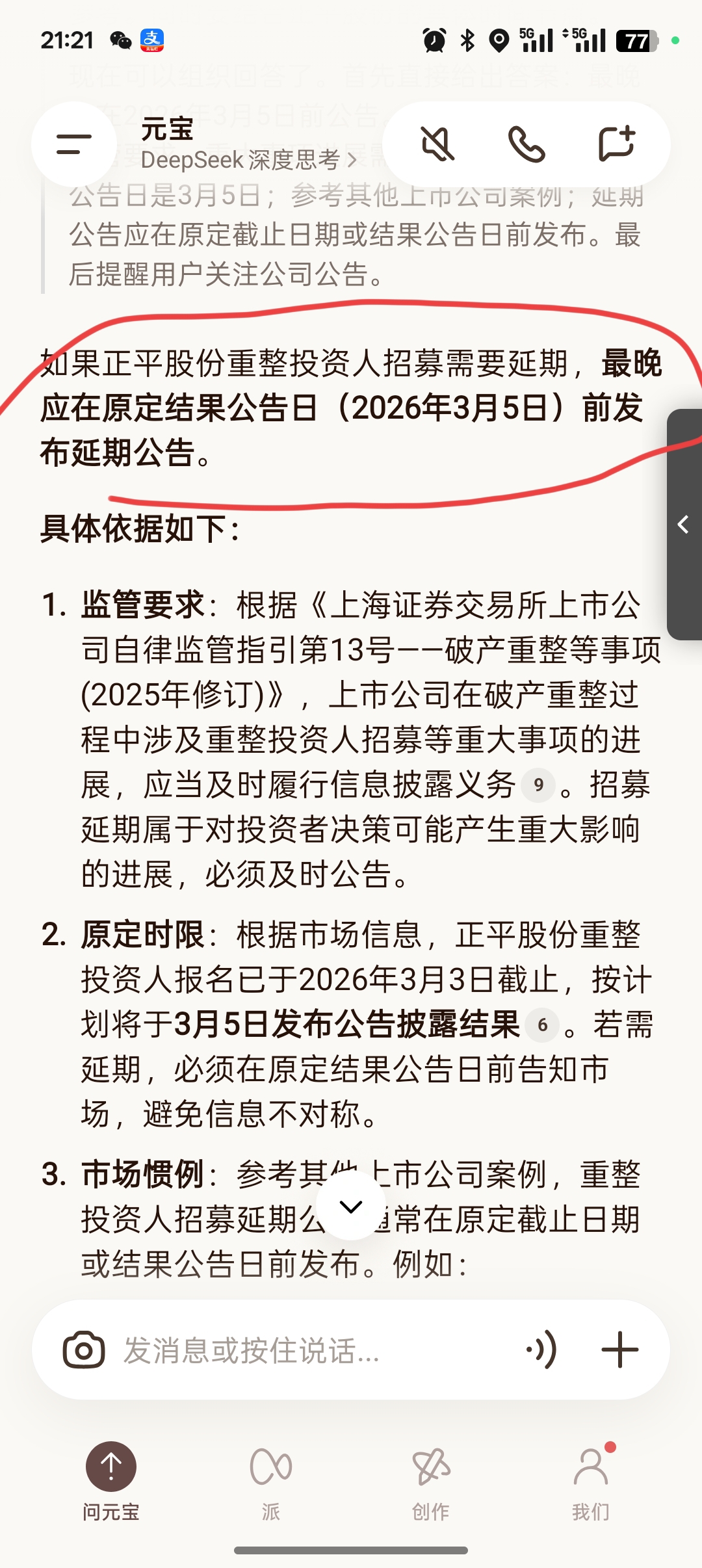 $*ST正平(SH603843)$ 有惊无险的度过了一晚,招募战投延迟的公告没有。现在就看5号晚上会不会出招募战投人失败的公告。如果没有,说明战投人招募顺利推进中。再熬明天一个晚上,基本就差不多能知道底牌了…