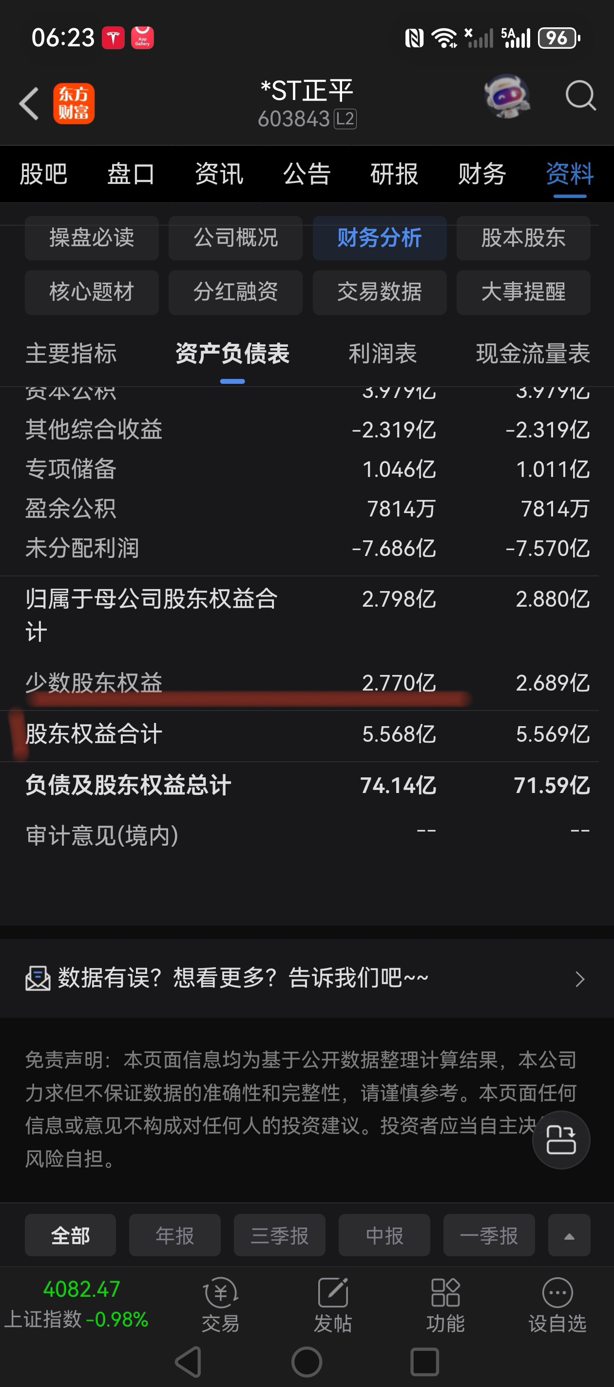 $*ST正平(SH603843)$ 第三季度结束归母公司净资产2.8亿,实际还有少数股东权益2.77亿,预告这次归母净利润扣非都没有变化,净资产减少部分只能说明是少数股东(子公司)部分计提了,所以合并后的净资产才能减少,母公司的债权已经申报确认,那子公司的还没有申报应该是这部分财务处理了,所以综上所述公司的审计更加健康,金度没有那么没有水平,搞成负的,自己忙活4个月,忙个寂寞吗!
