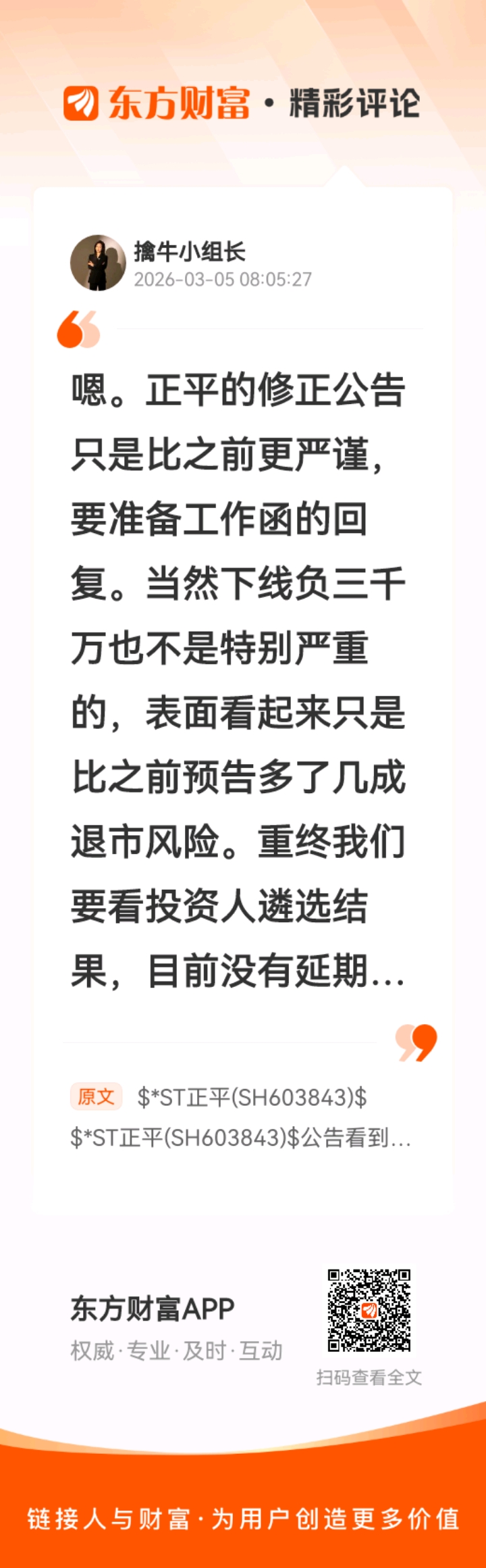 //@擒牛小组长 :嗯。正平的修正公告只是比之前更严谨,要准备工作函的回复。当然下线负三千万也不是特别严重的,表面看起来只是比之前预告多了几成退市风险。重终我们要看投资人遴选结果,目前没有延期遴选或者终止重整的公告,就是好事。没有消息就是好消息。