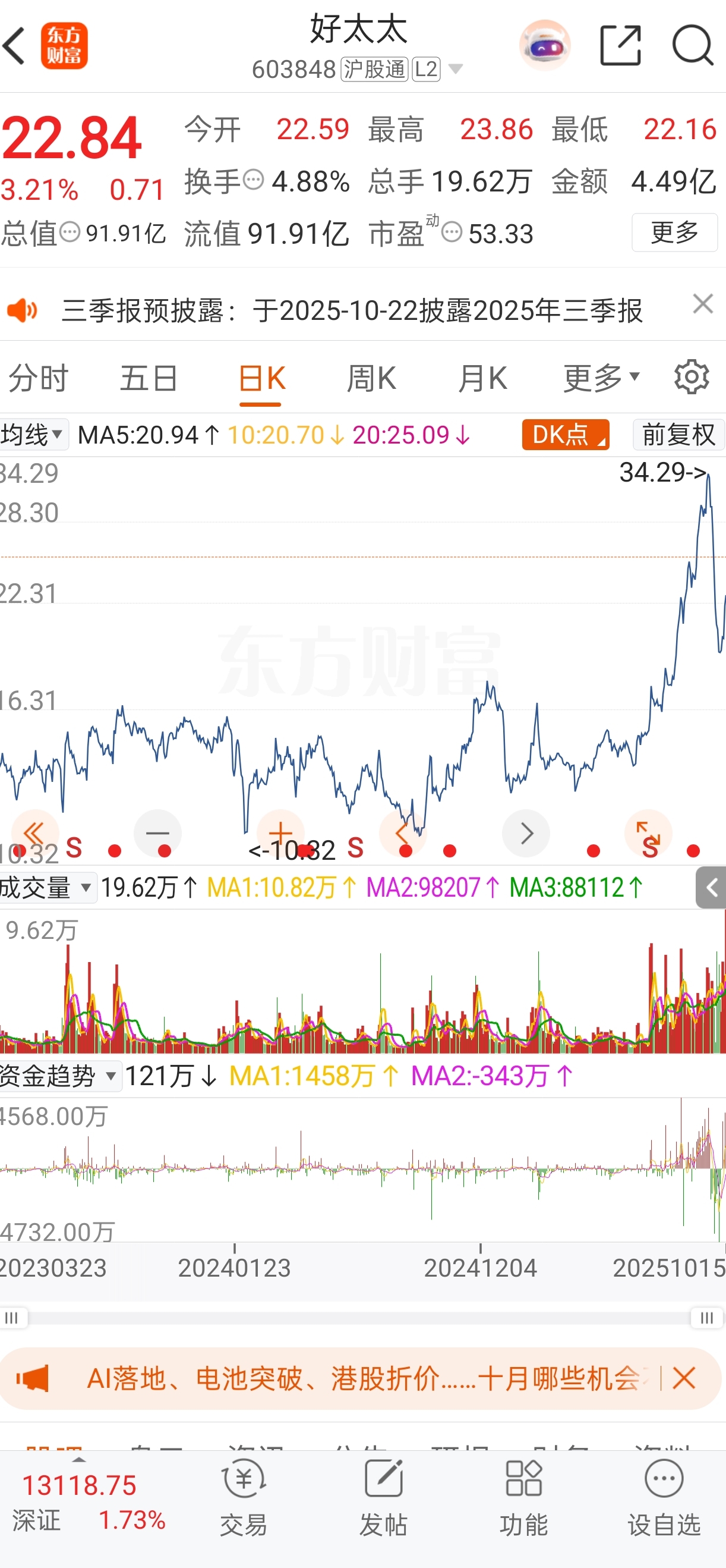 $好太太(SH603848)$ 什么时候能回本啊?黄线是成本线。