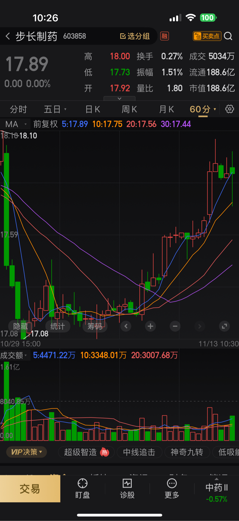 $步长制药(SH603858)$ 60分钟k线多头排列向上分散,短线继续向上