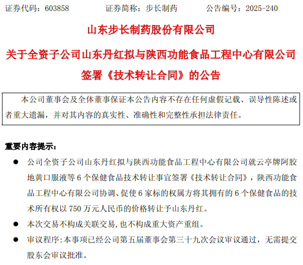 12月24日,步长制药(603858)发布公告,陕西功能食品工程中心有限公司协调、促使6家标的权属方将其拥有的6个保健食品的技术所有权以750万元人民币的价格转让予公司全资子公司山东丹红。