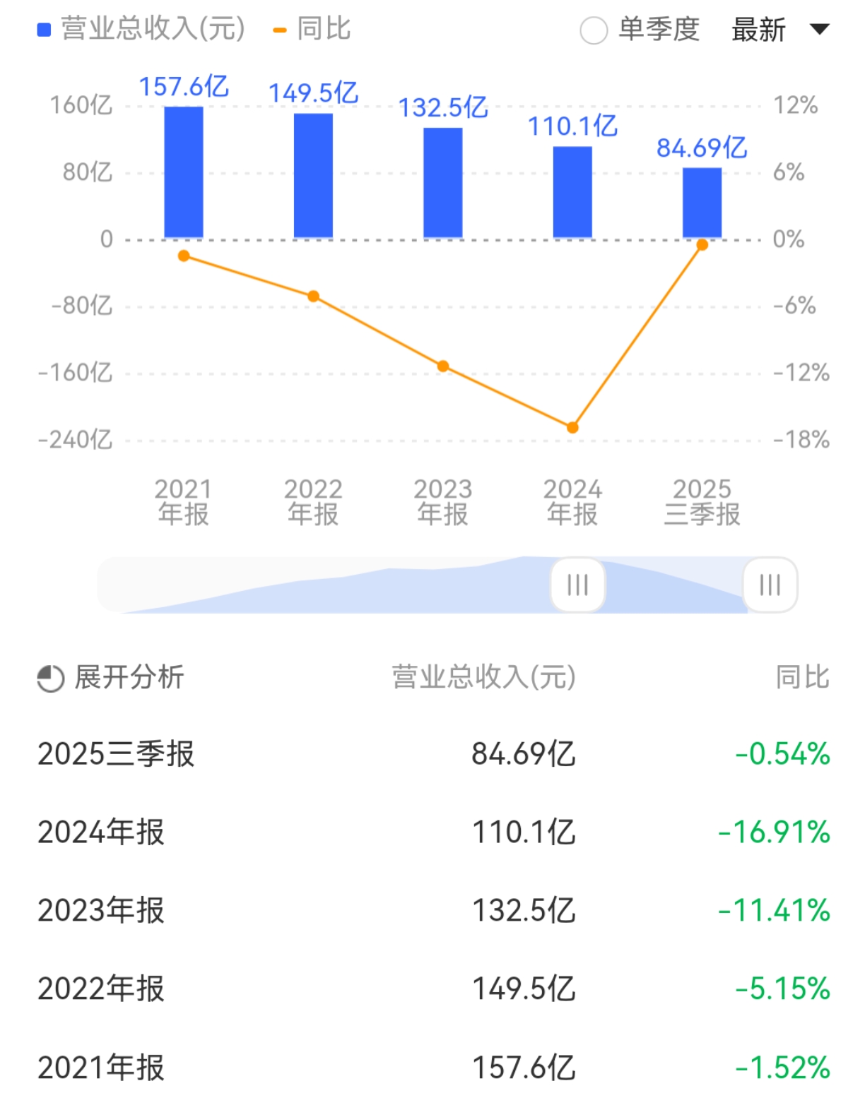 2025年前三季度,公司营收继续承压,净利大幅回暖。公司实现营业总收入84.69亿元,同比下降0.54%;归母净利润8.68亿元,同比增长177.54%;扣非净利润8.55亿元,同比增长138.26%。