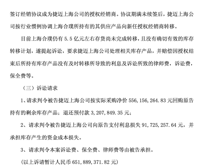 上海合璞的诉讼请求直截了当:要求捷迈上海公司按原采购价回购全部剩余库存,并退还预付款,并赔偿相应的利息及资金成本损失,总金额锁定在6.52亿元。
