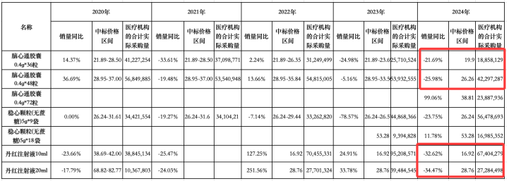 近年来,尽管脑心通胶囊、稳心颗粒、丹红注射液三大独家品种仍支撑着公司过半营收,但在集采常态化推进下,多款主力规格产品无论是销量、中标价格还是医疗机构采购量均承受下行压力(如图),业绩整体承压。2020年至2024年,公司营收从160.07亿元降至110.06亿元;2024年归母净利润亏损5.54亿元,继2022年后再次录得亏损。