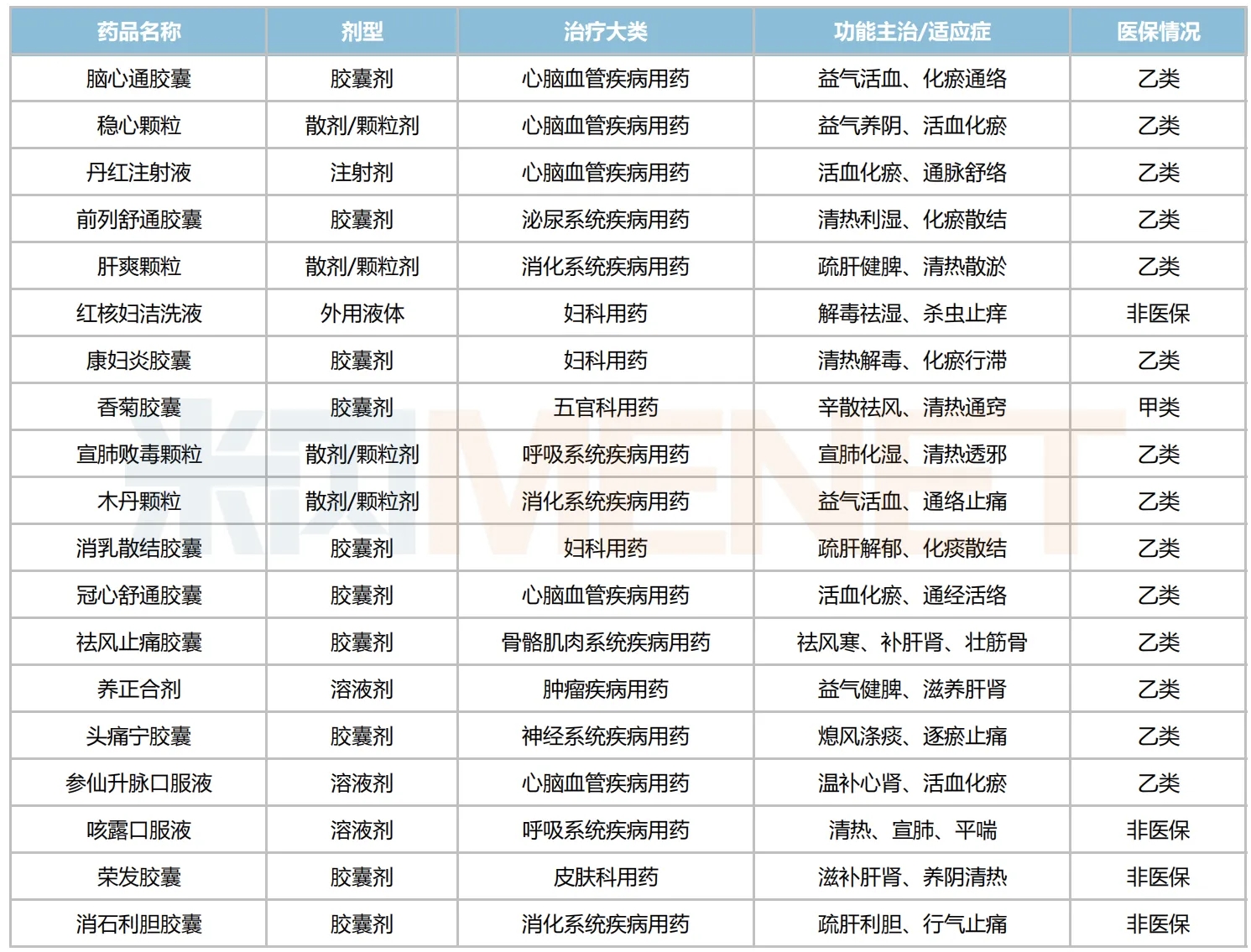 19个主要在售的中成药中,清一色为独家品种;从剂型上看,胶囊剂以10个产品在数量上领跑;按治疗大类统计,心脑血管疾病用药为主力军,占5个席位;医保情况方面,医保甲类药有1个,医保乙类药有14个,非医保药有4个。