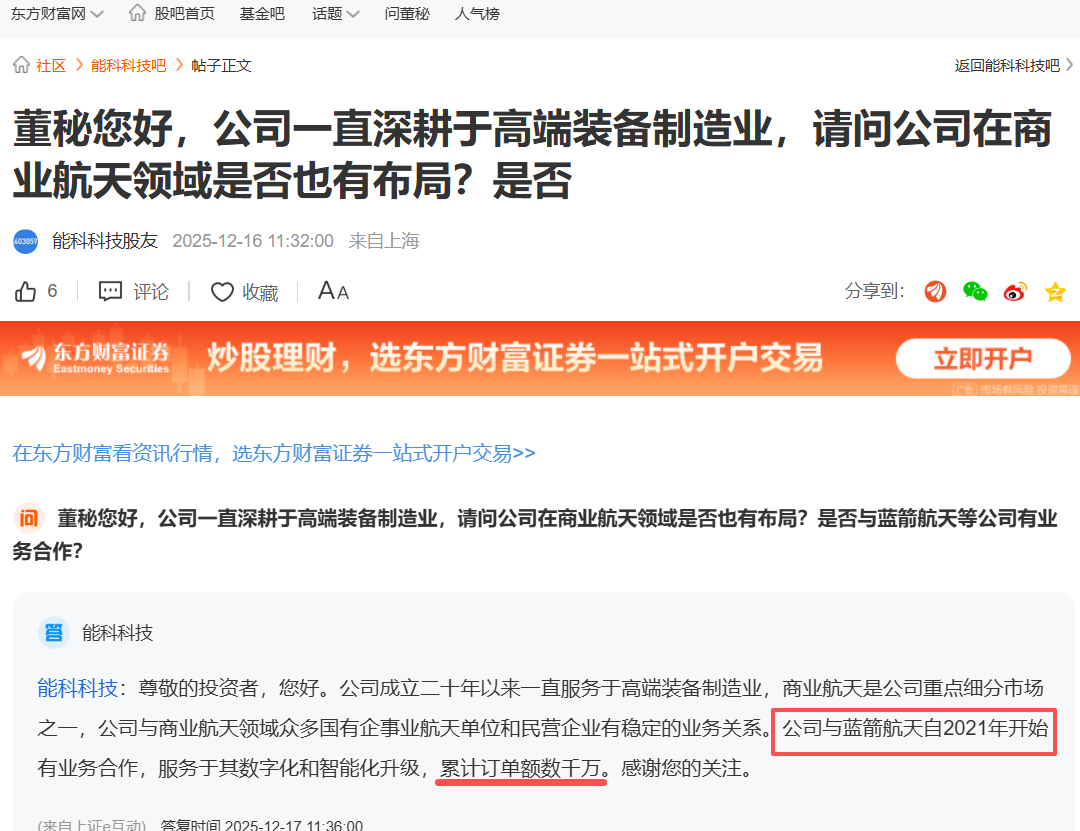 能科科技:与蓝箭航天累计订单额数千万元,商业航天+人形机器人+智谱AI+军工