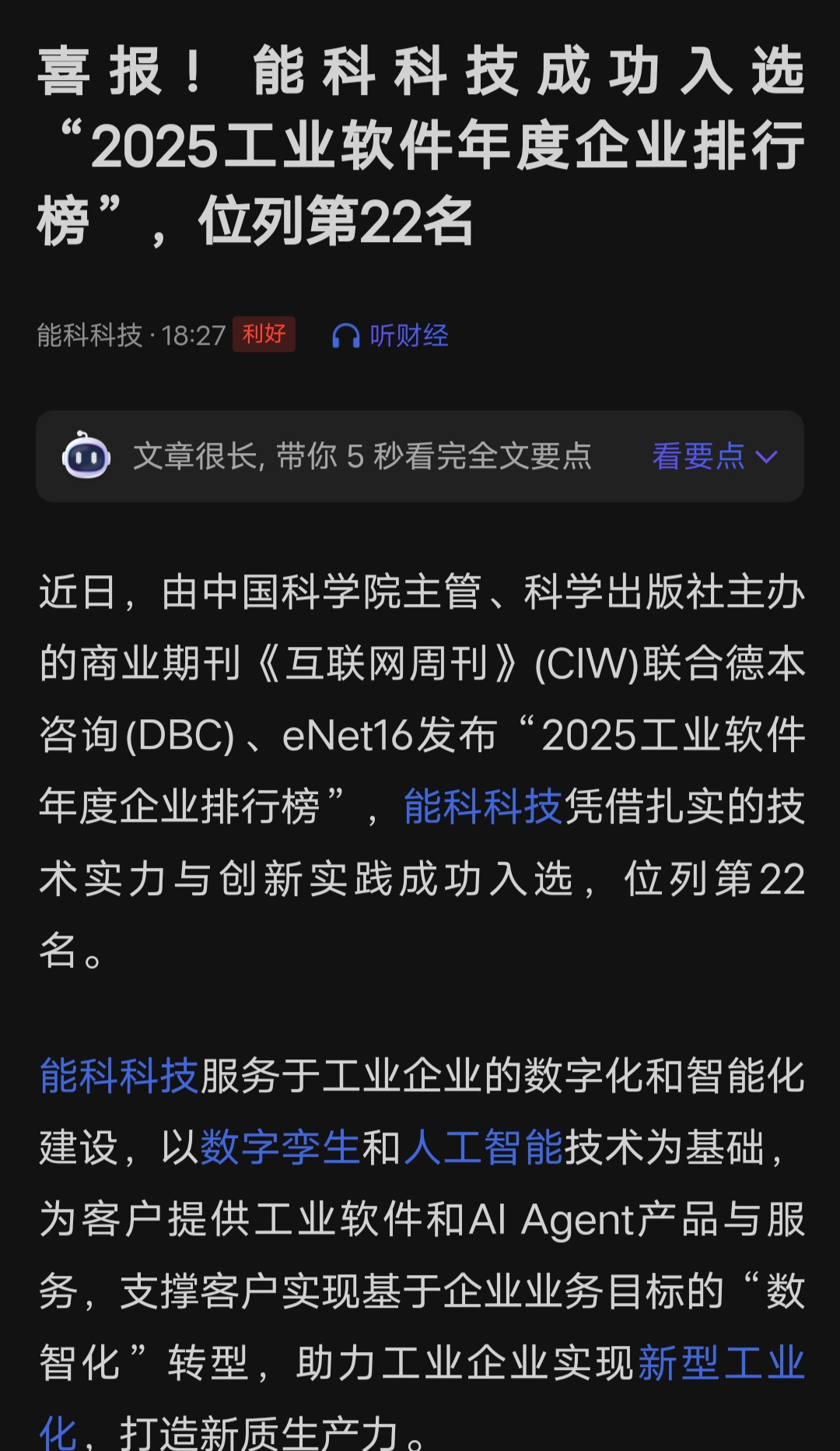 $能科科技(SH603859)$ 由中国科学院主管、科学出版社主办的商业期刊《互联网周刊》(CIW)联合德本咨询(DBC)、eNet16发布“2025工业软件年度企业排行榜”,能科科技凭借扎实的技术实力与创新实践成功入选,位列第22名。