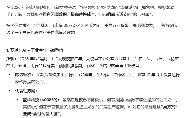AI应用+军工+航天+具身智能+毛利大于50%,百倍股。AI说这是百倍股我才买的