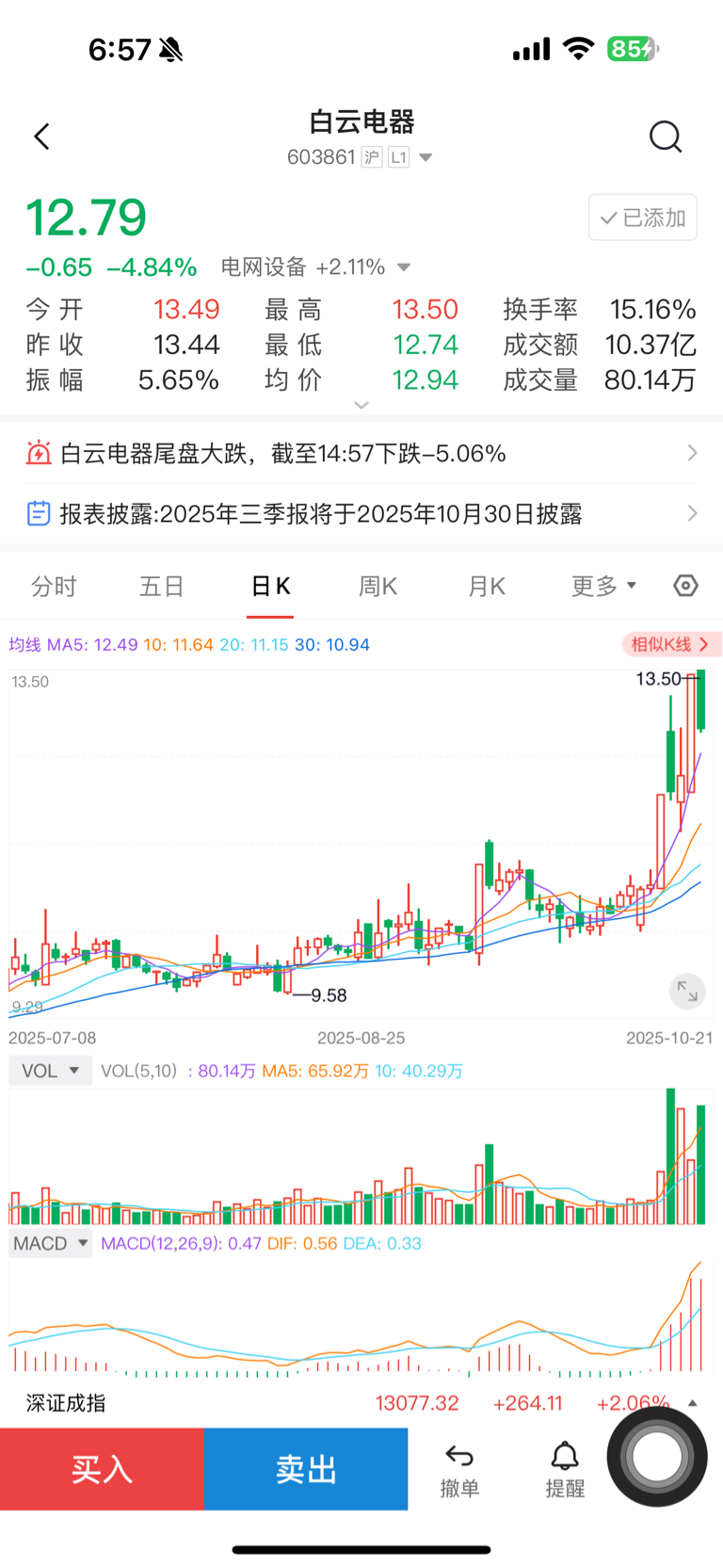 $白云电器(SH603861)$ 走势还是很不错的,多头上涨趋势,计划明天水下低吸,五日线不破趋势就还在,明日低吸后天吃肉