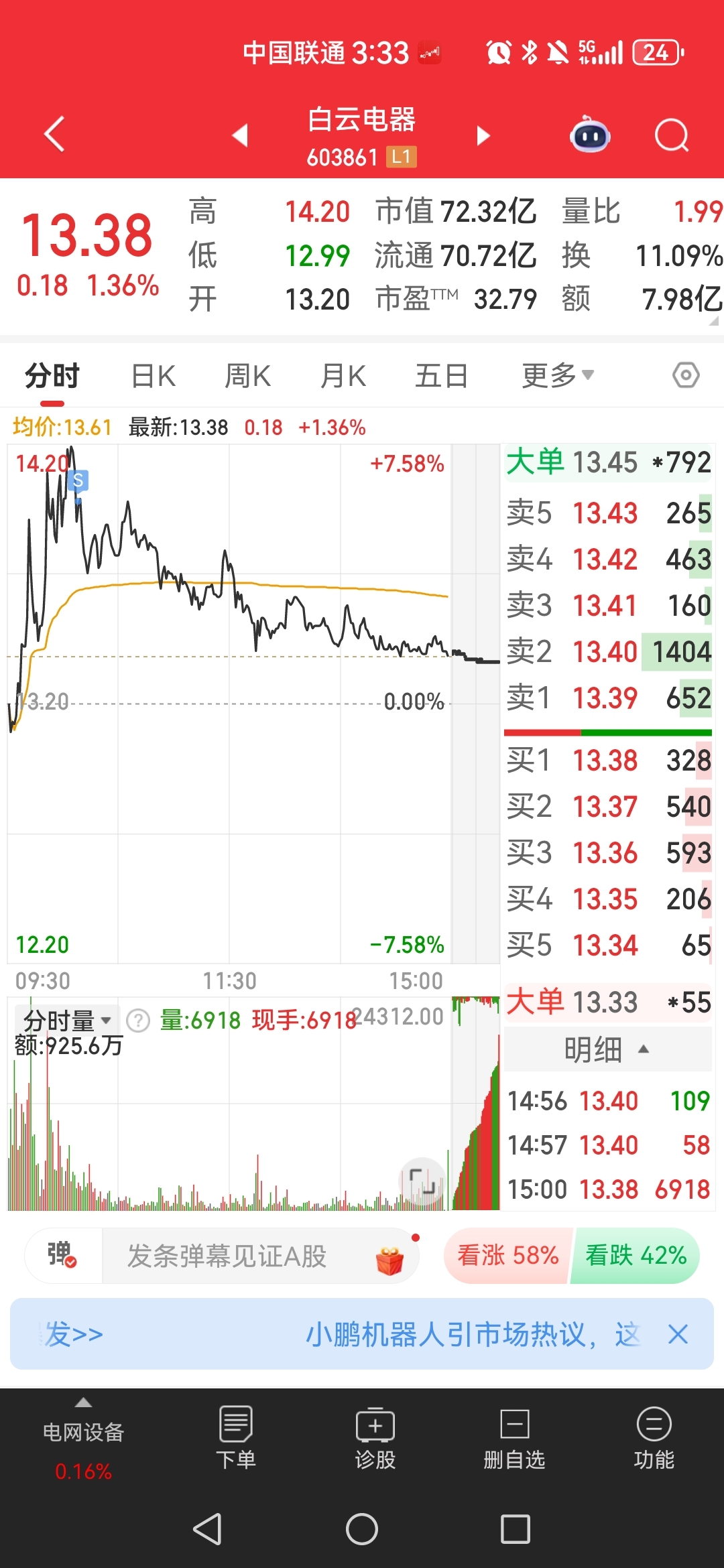 $白云电器(SH603861)$ 孙经理14元暂时止盈一部分