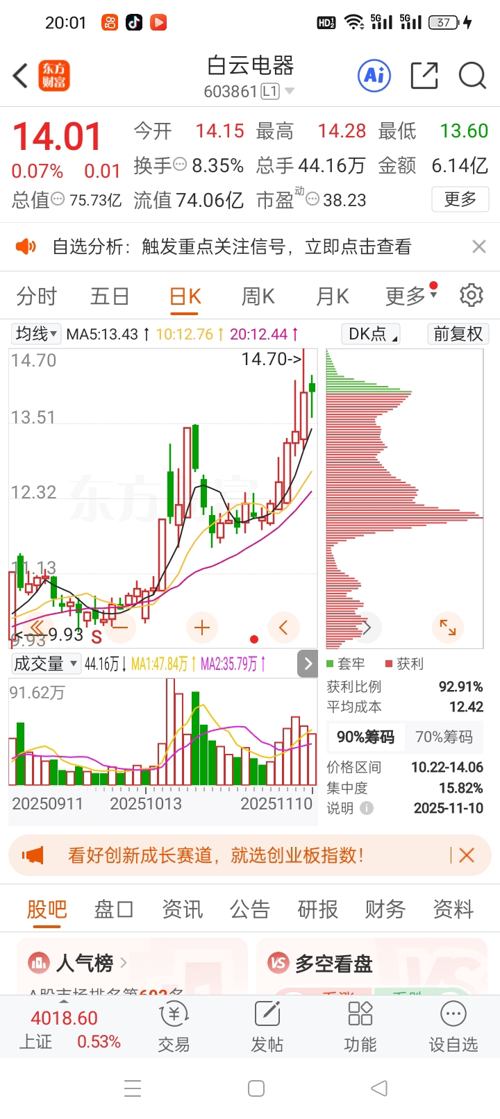 $白云电器(SH603861)$ 主力筹码没动。均线多头排列。K线形态长腿美女。昨天洗盘。筹码集中在胡氏五兄弟手上。市值先拉到100亿元,现在市值74亿元。绩优股。中标九个电力投标项目。业务饱满。上升趋势不变。主升浪才开始,满仓买入,稳赚不赔。