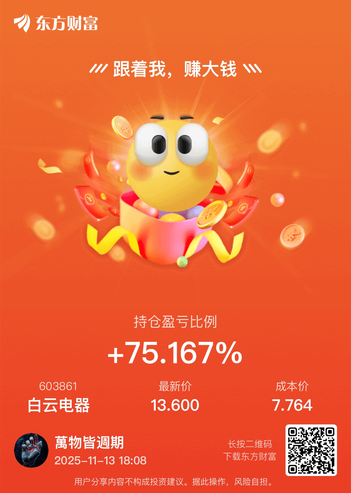 $白云电器(SH603861)$ 你这东西真是不争气,要么早点拉上去到我价格让我走,下个标的都选好了,就打个底仓,今天它都破前高了,我又没机会了