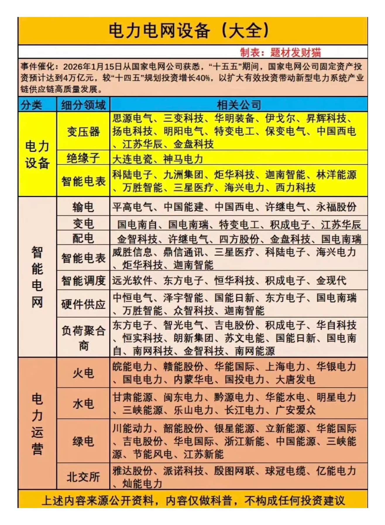 电力电网设备!(全景梳理)1.19日,整个市场智能电网板块,累计23股涨停。AI算力需求和新能源汽车,电力相关市场未来有广阔发展空间。算力的尽头是电力!1.电力设备2.智能电网3.电力运营