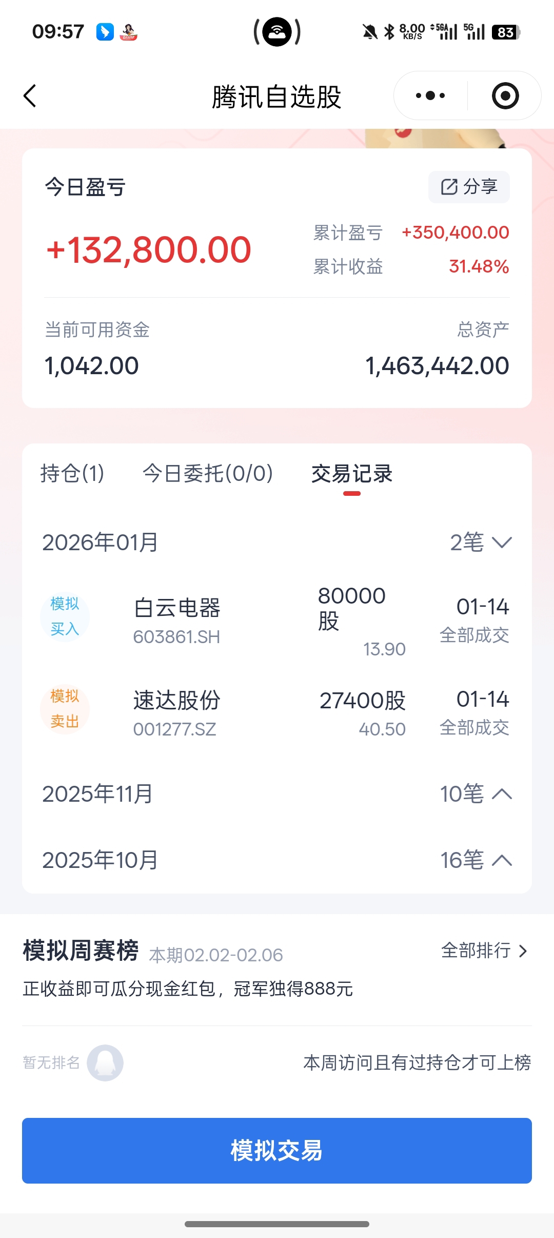 还是不错,抓到一只,虽然没有资金玩的是模拟。及时回来了,期间没有选择做t,原因都