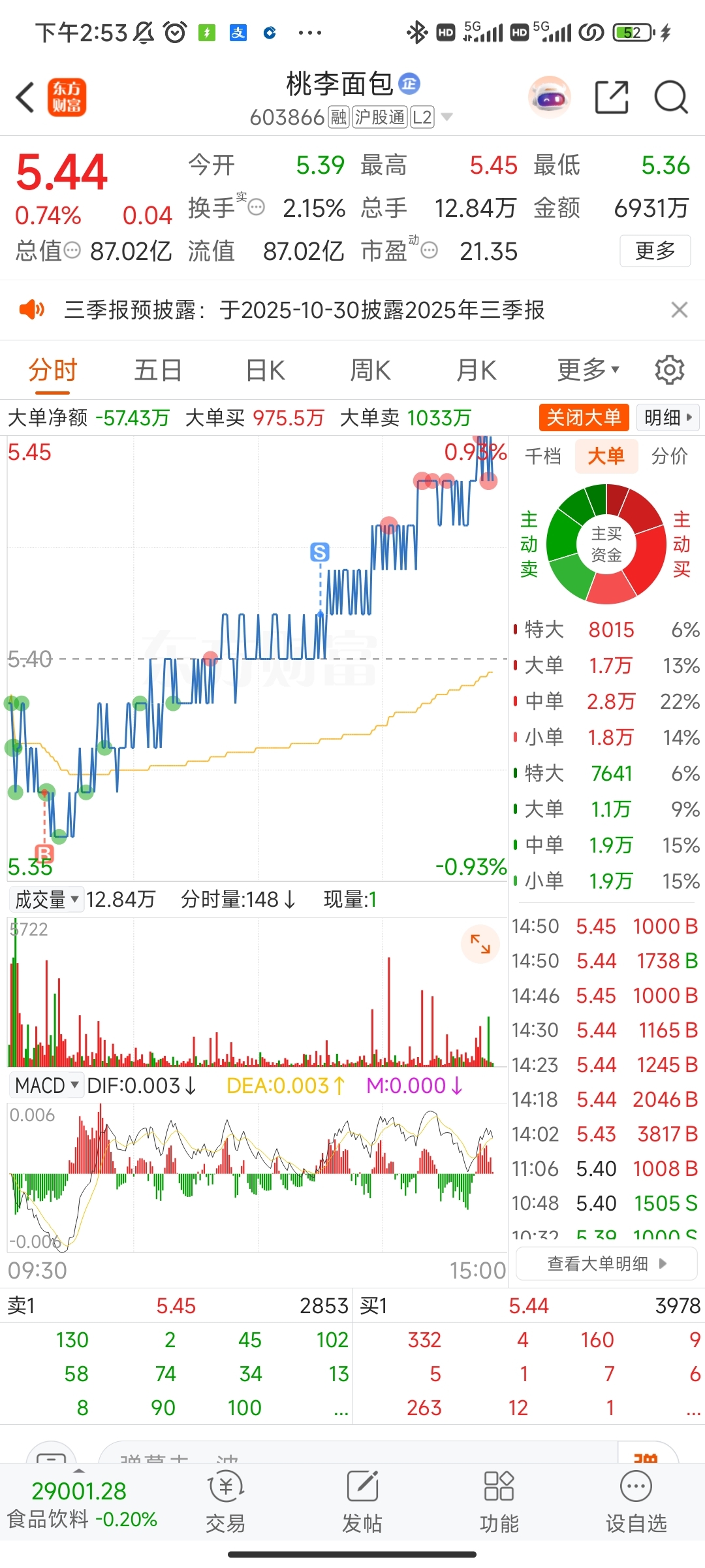 $桃李面包(SH603866)$ 今天还t飞了,我多卖了几百股。不过也罢,给桃李面包道个歉,今天红四分钱也算对得起我了。