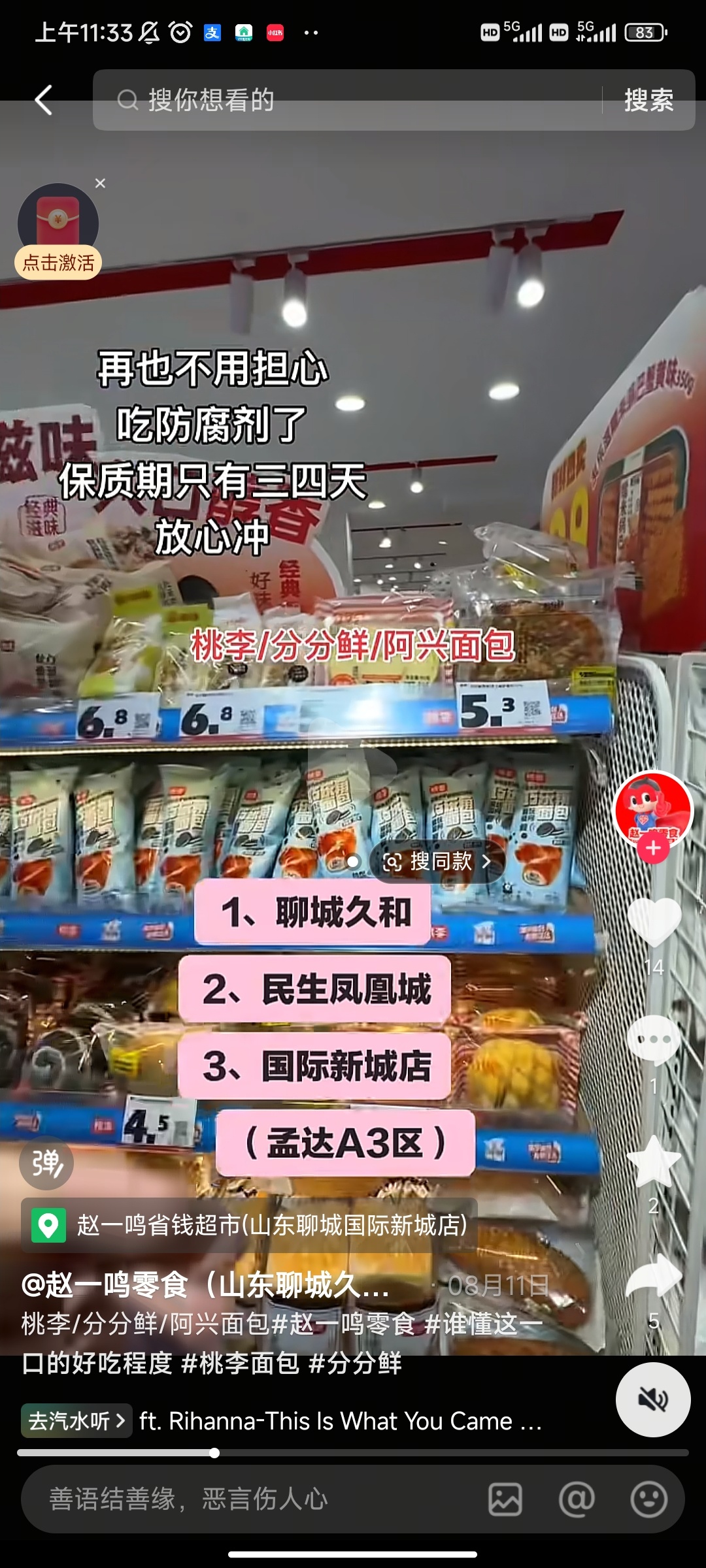 我刚刚去抖音搜了一下。桃李面包在部分地区的赵一鸣和好想来都有上架,渠道拓宽上面是