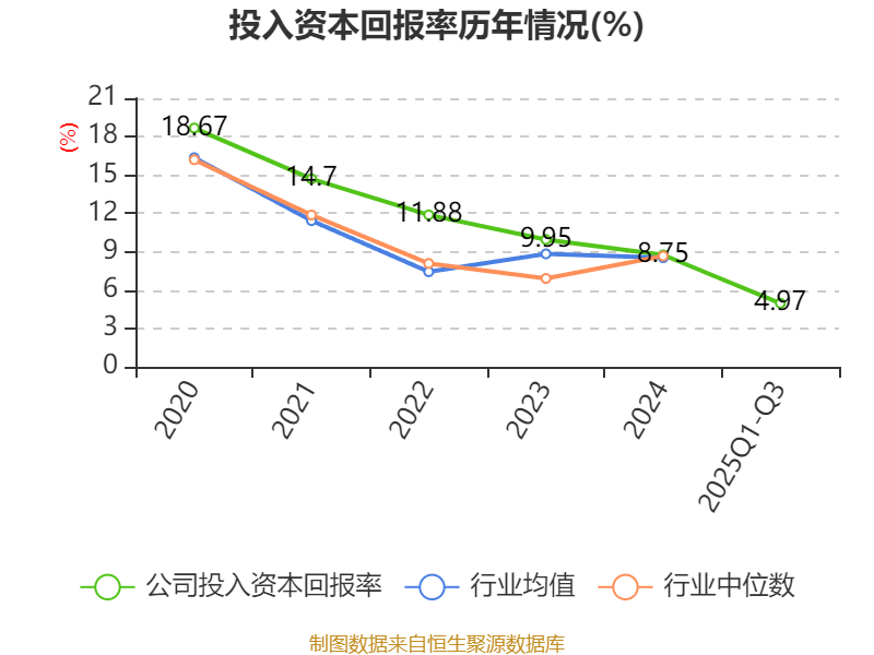 盈利能力方面, 2025年前三季度公司加权平均净资产收益率为5.77%,同比下降2.68个百分点。公司2025年前三季度投入资本回报率为4.97%,较上年同期下降2.3个百分点。