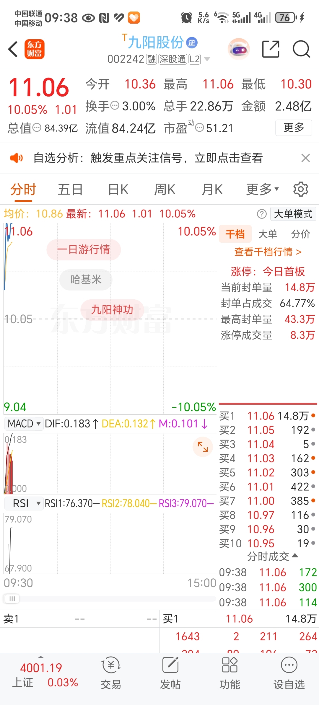 前几天推给你们的九阳股份涨停了,俺吃了一个十几个点不过就买了一百股