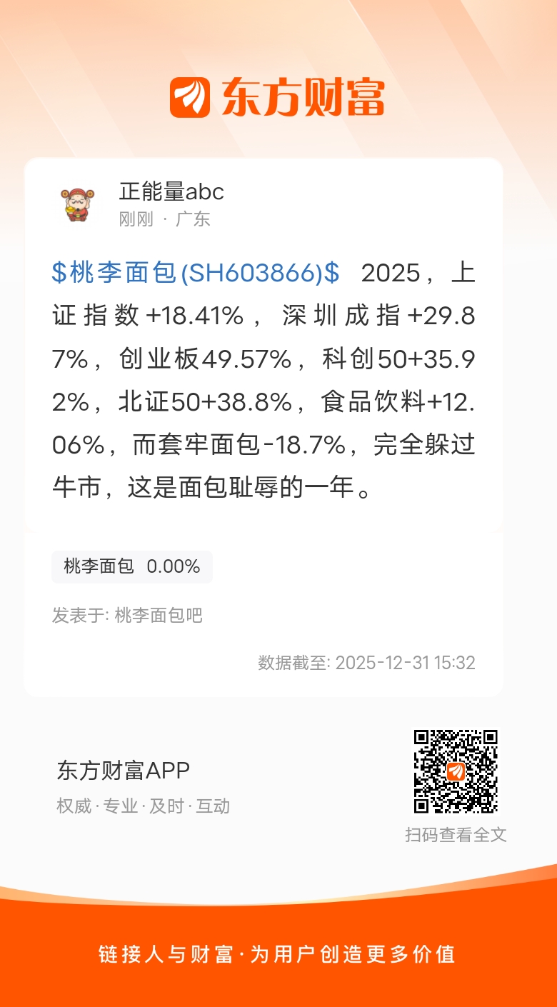 $桃李面包(SH603866)$ 2025,上证指数+18.41%,深圳成指+29.87%,创业板49.57%,科创50+35.92%,北证50+38.8%,食品饮料+12.06%,而套牢面包-18.7%,完全躲过牛市,这是面包耻辱的一年。
