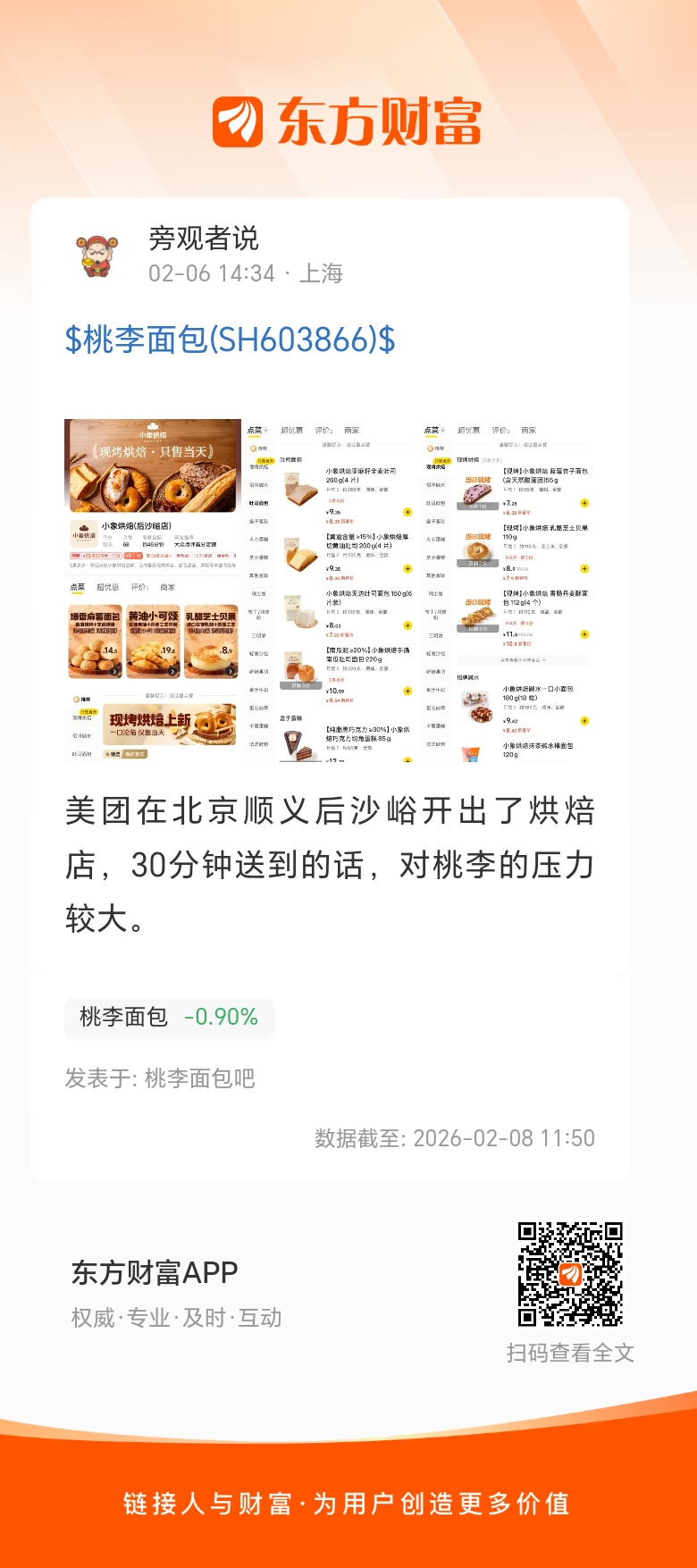 美团在北京顺义后沙峪开出了烘焙店,30分钟送到的话,对桃李的压力较大。