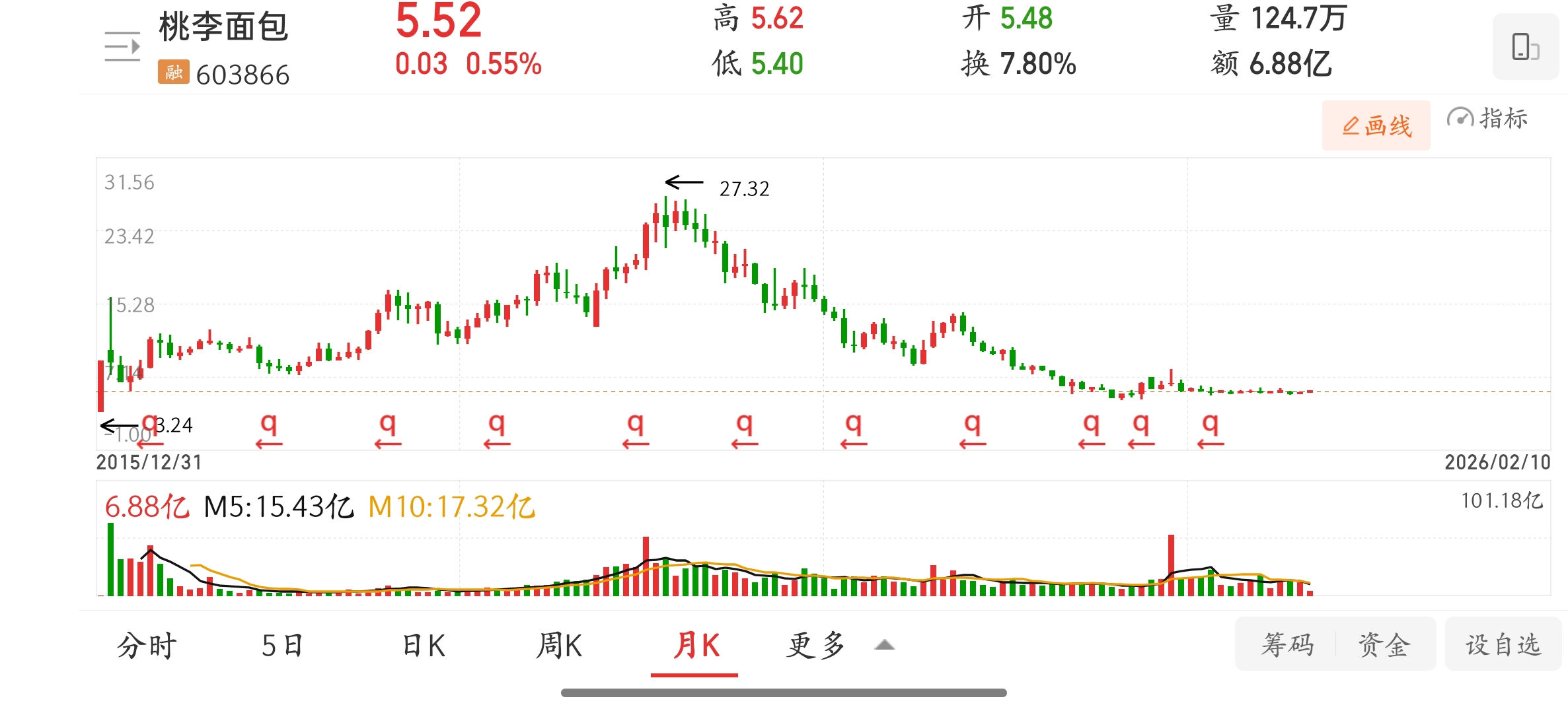 $桃李面包(SH603866)$ 看月线,谁能赚到钱?每天都给国家上交印花税。(我不会买它。但此庄属恶的,我忍不住贬它)