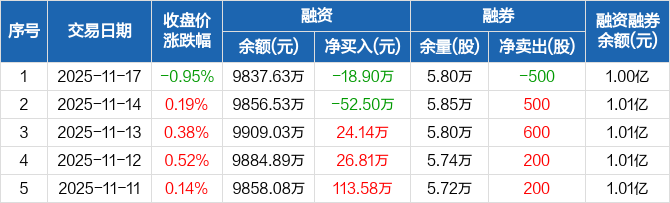 飞科电器:融资净偿还18.9万元,融资余额9837.63万元(11-17)