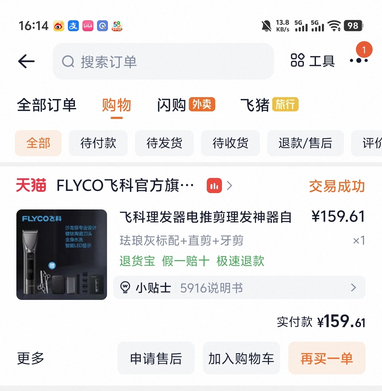 网上买的飞科理发器,希望股价能涨上来