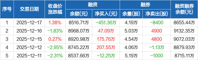 飞科电器:融资净偿还451.36万元,融资余额8516.71万元(12-17)
