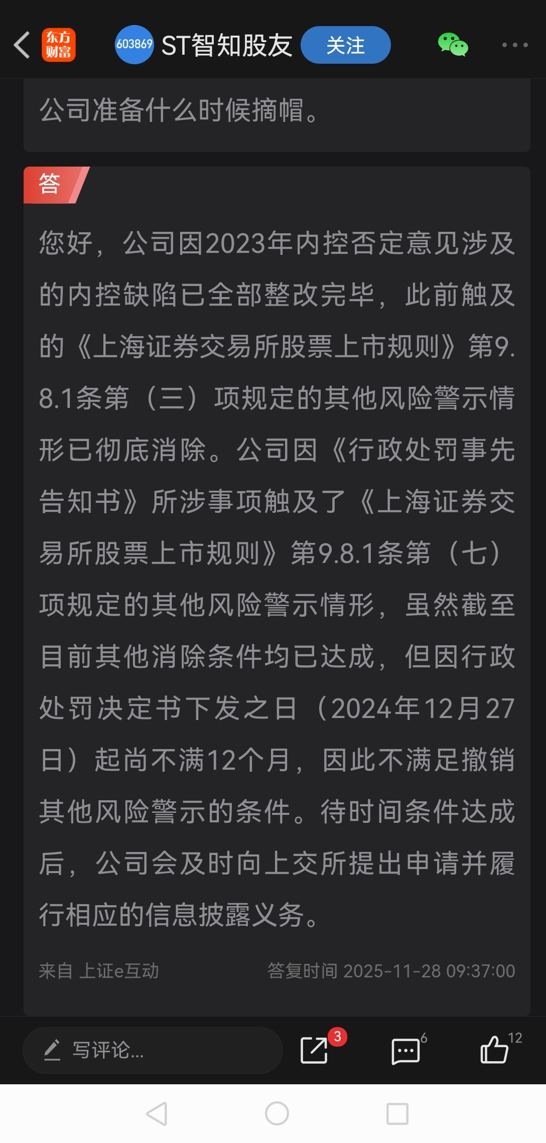 $ST智知(SH603869)$ 公司自己白纸黑字写的,时间一到及时申请摘帽