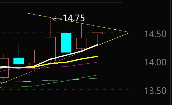 14.50元是个阻力位,几次突破未果,后进行了一个三角形整理,有待突破、祝突破成功。