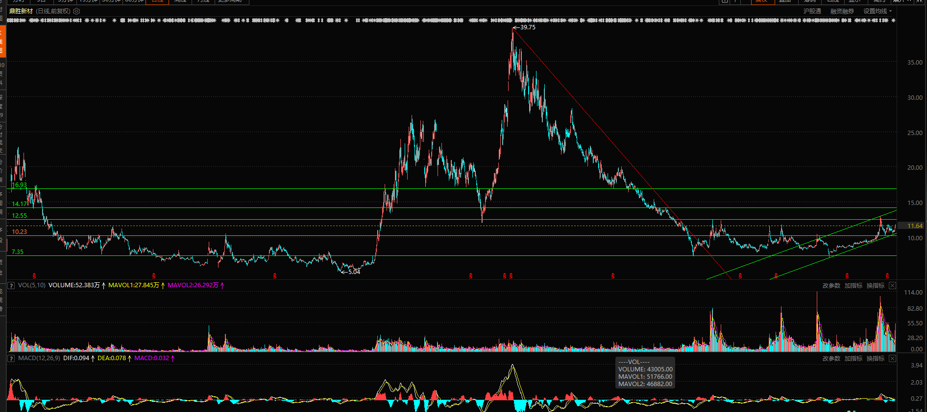 底部两年的箱体,我倾向于在10.23和12.55的位置震荡一段时间,震荡的时间越久,将来突破后的行情越大。不能有效跌破10.23.