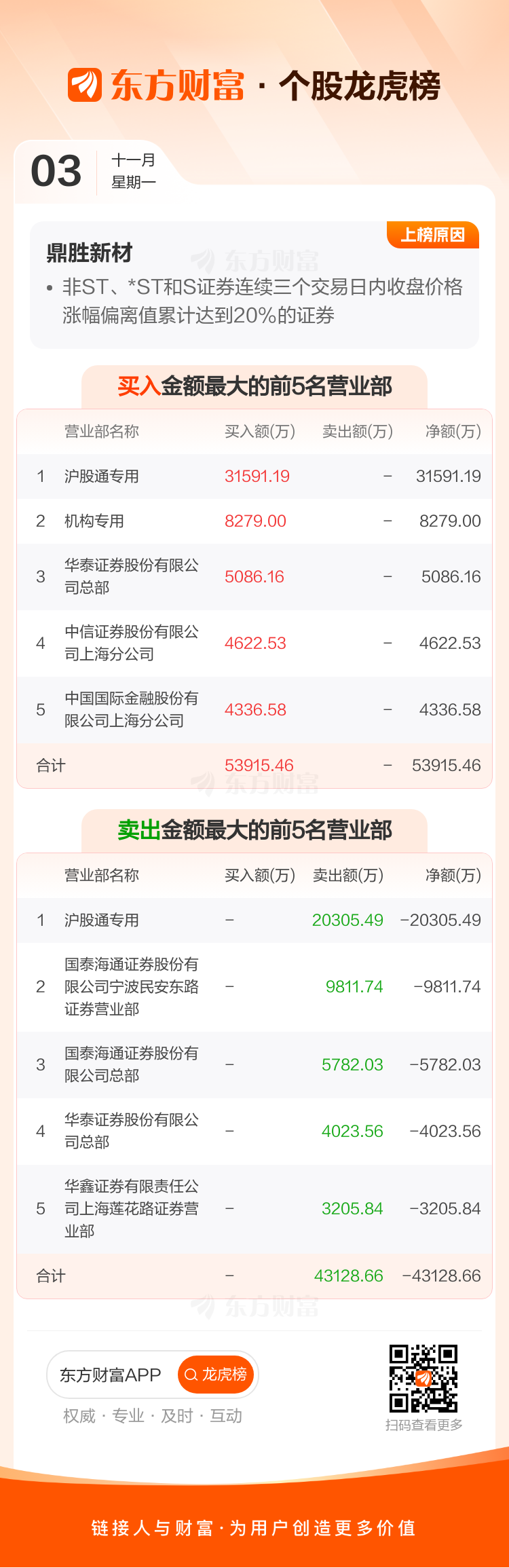 鼎胜新材(603876)龙虎榜数据(11-03)