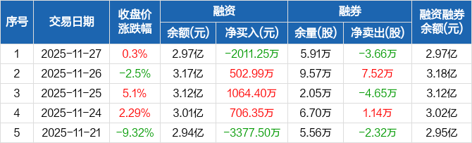 鼎胜新材:融资净偿还2011.25万元,融资余额2.97亿元(11-27)