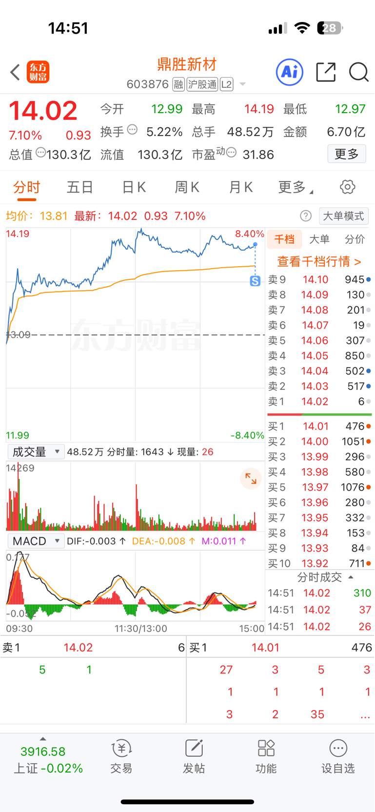 $鼎胜新材(SH603876)$ 赚了9个点先撤了,明天在接