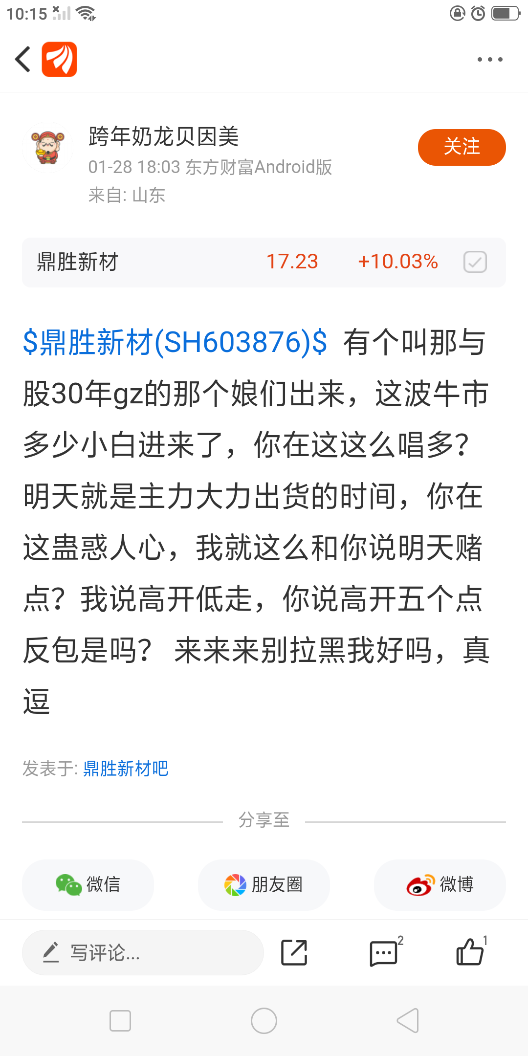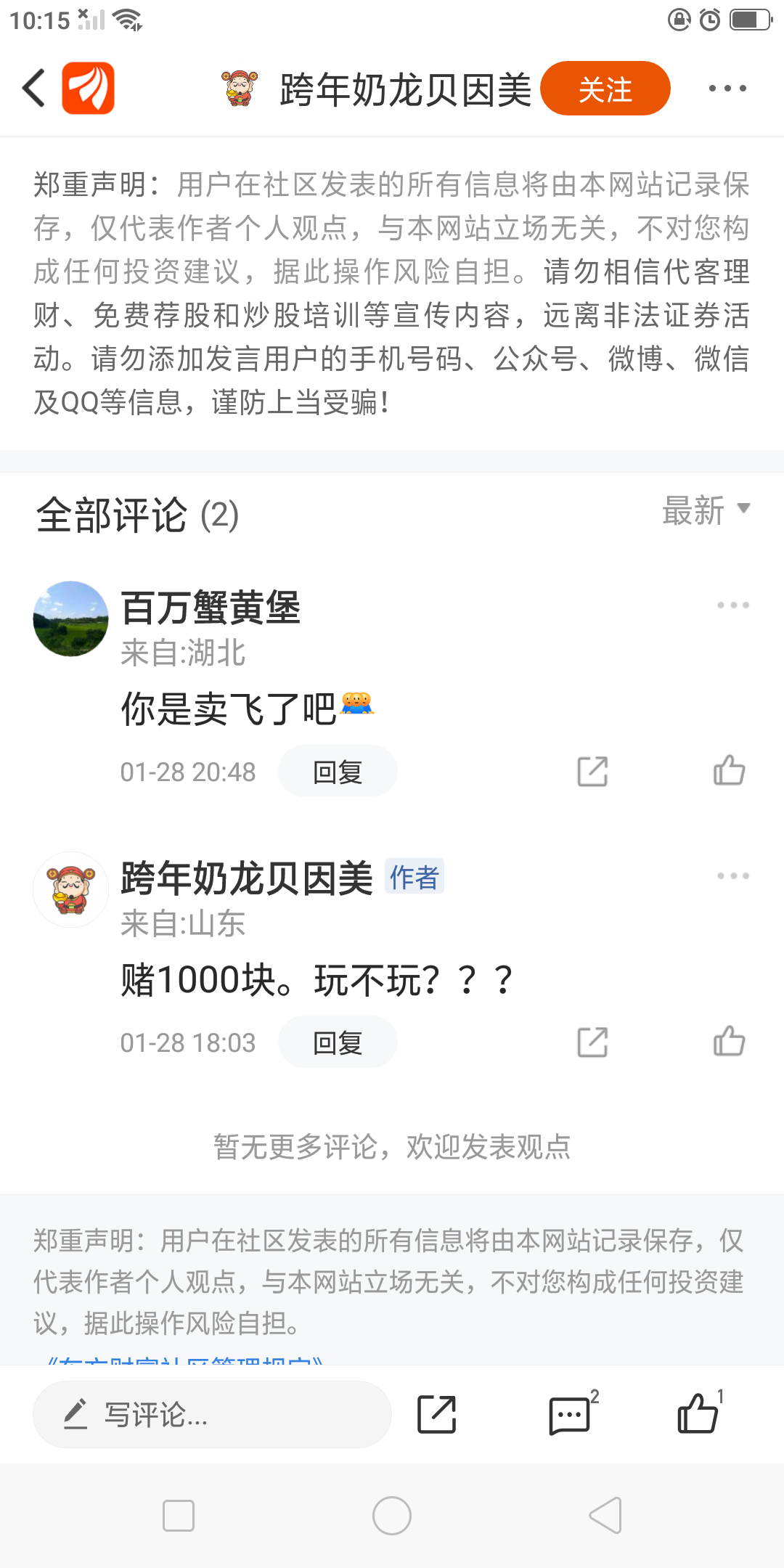 温馨提示: 1.根据《证券法》规定,禁止编造、传播虚假信息或者误导性信息,扰乱证券市场;2.用户在本社区发表的所有资料、言论等仅代表个人观点,与本网站立场无关,不对您构成任何投资建议。用户应基于自己的独立判断,自行决定证券投资并承担相应风险。《东方财富社区管理规定》