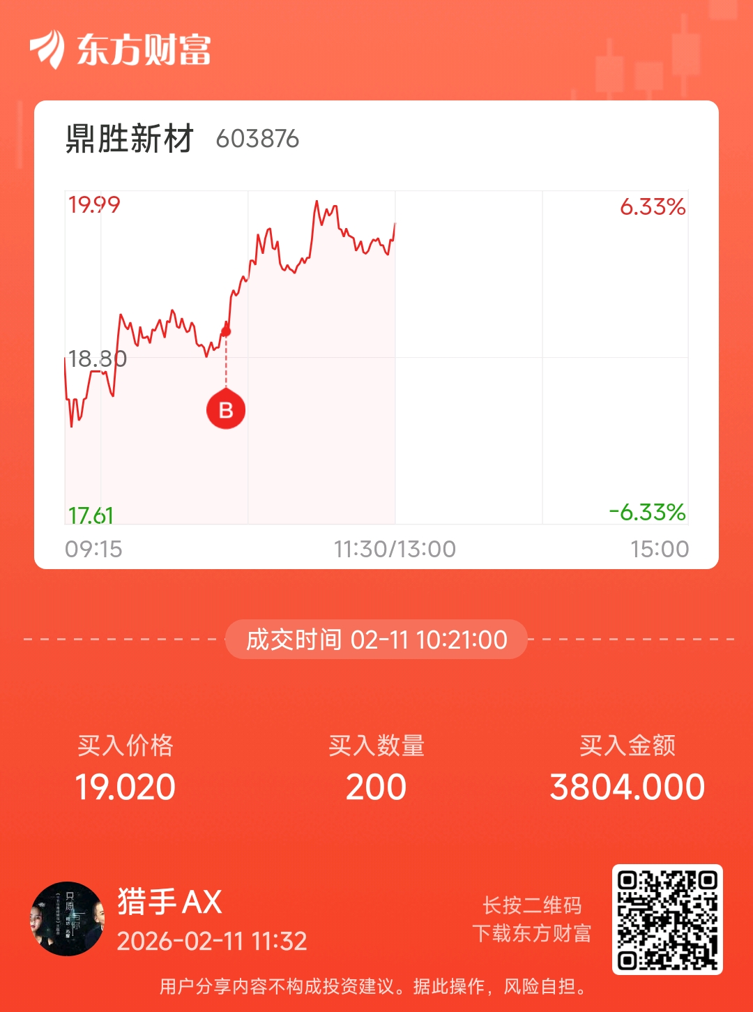 今日成交股票:鼎胜新材操作原因:板块有风,买两手玩