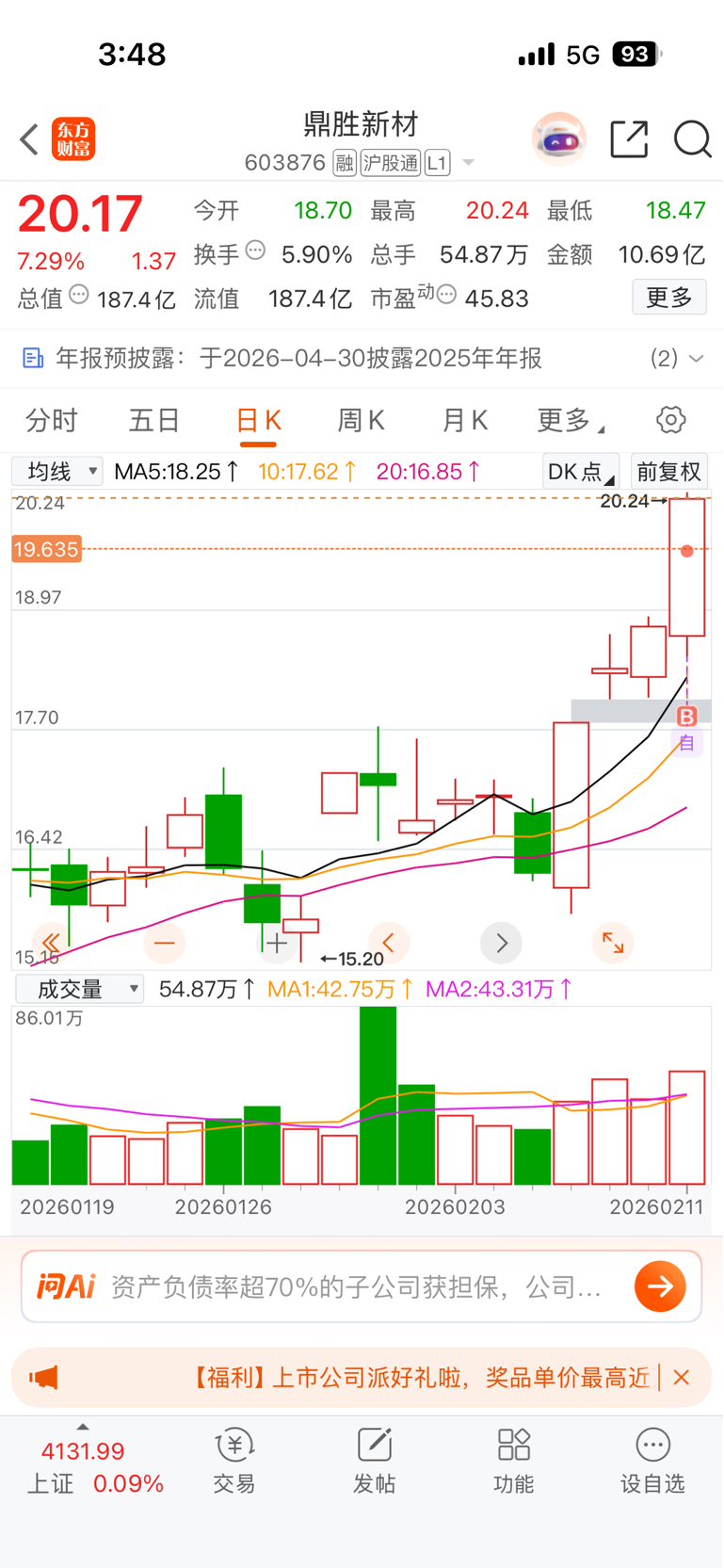 $鼎胜新材(SH603876)$ $电声股份(SZ300805)$ 鼎胜新材明天要是高开高走就是最佳的买入点,新的一轮加速趋势形成,喜鹊闹梅,今天竞价卖了文化传媒,追高这个半仓,明天要是能红稳,直接加仓,要是弱势不能翻红直接清仓。