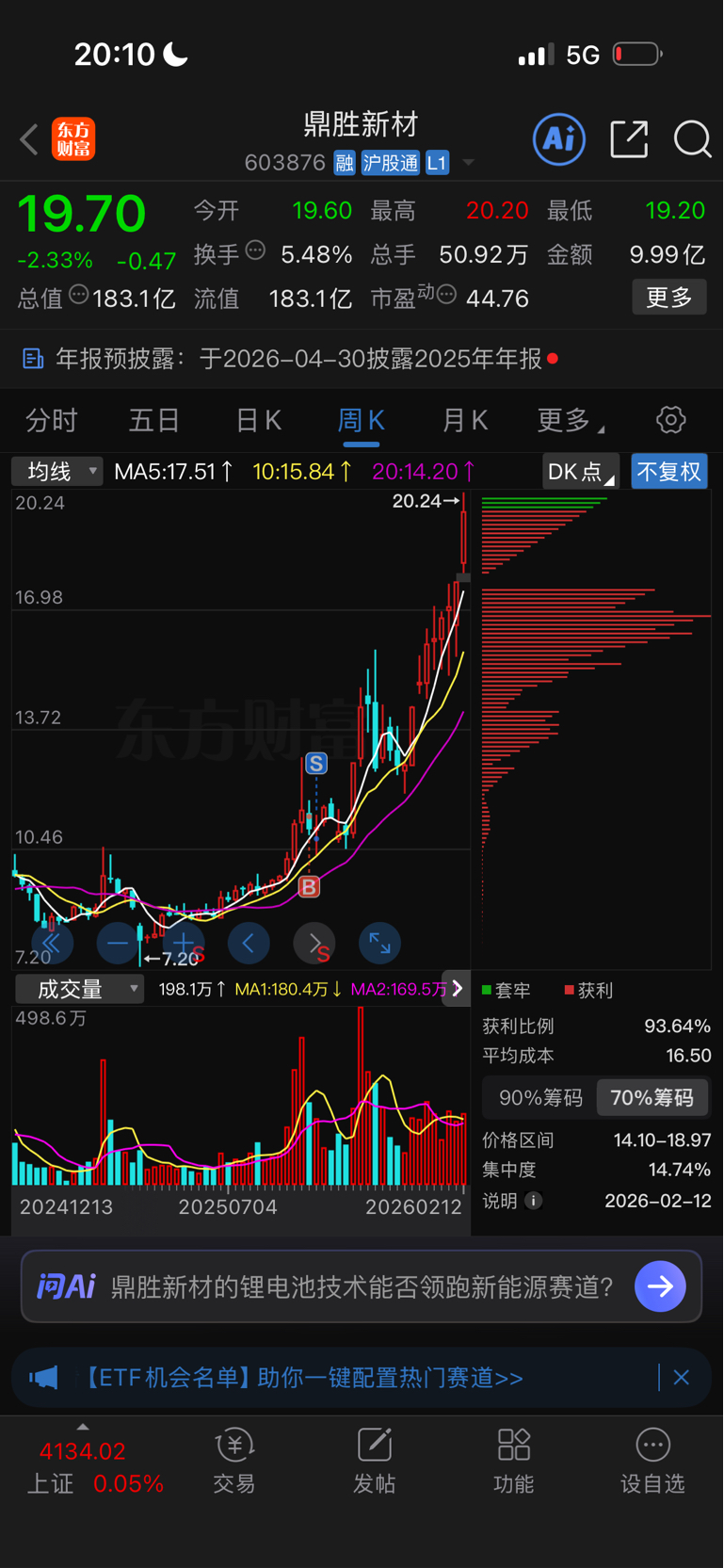 $鼎胜新材(SH603876)$ 复盘到几个月前,选股能力无敌哈哈哈。那个时候才开户十天,啥都不懂,但研究了好多同类型公司,最终选择了这家。可惜当时不懂的趋势,时机,热点,也拿不住有波动的票,看不懂量能和大盘。