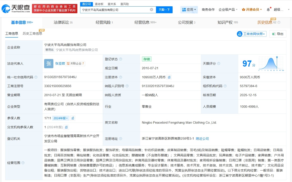 太平鸟风尚服饰公司增资至10.95亿 增幅约1053%