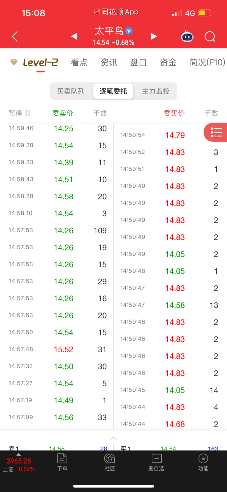 $太平鸟(SH603877)$ $太平鸟社区(603877)$ 14.59.53的时候主力在竞价量化丢了200多手,尾盘竞价并没有任何主力跟随抢筹,反而卖单有很多拆单在丢,明天仍然下行[棒],结合明天是出金日,主力更不可能让场内资金在明天有一个舒服的出场点位,真恶心[棒][棒]
